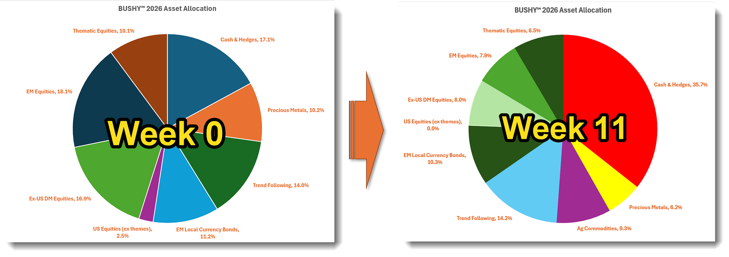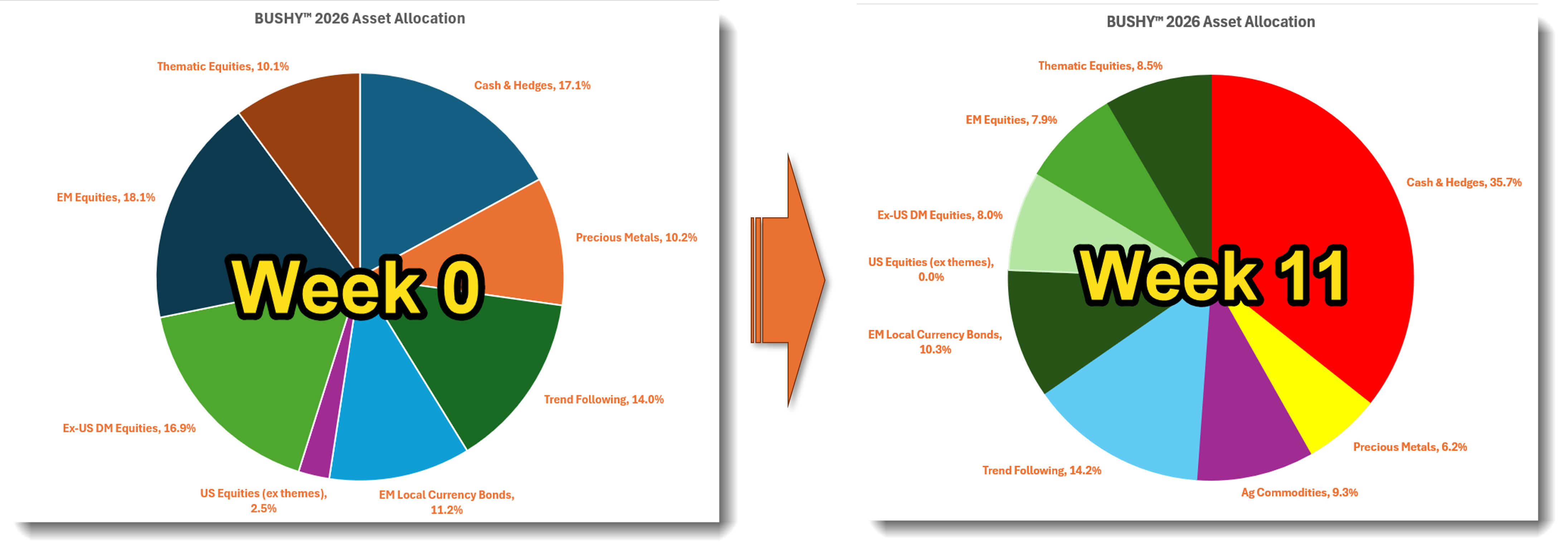 Comparing the composition of BUSHY™ today with the start of the year (image below), you can see just how defensive the portfolio has become even if the cash position was reduced partially with the addition of the “Malthus Ag Basket” this week. If the situation in the Middle East continues to fester, I am more than happy to de-gross further.