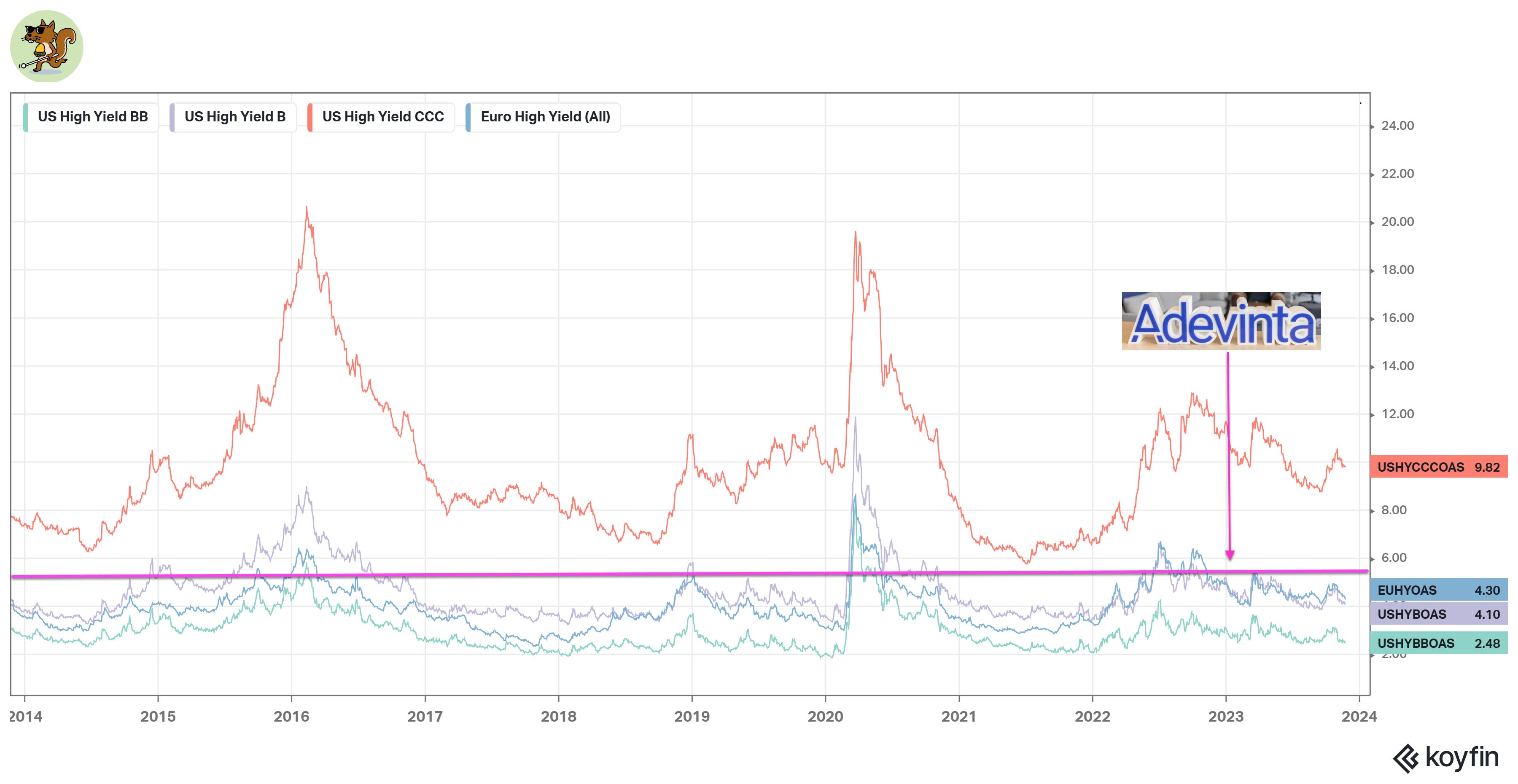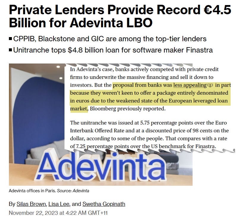 To make that crystal clear, credit investors in Euro High Yield market currently on average earn a credit spread (over risk free rates) of 4.3% - for bonds that trade freely in the market, with daily liquidity. Blackstone’s private credit LPs are going are going to receive a pick-up of less than 1.5% over that level on this Adevinta debt package and that is before deduction of management and performance fees (which I suspect would eat up more than half of that margin uplift).