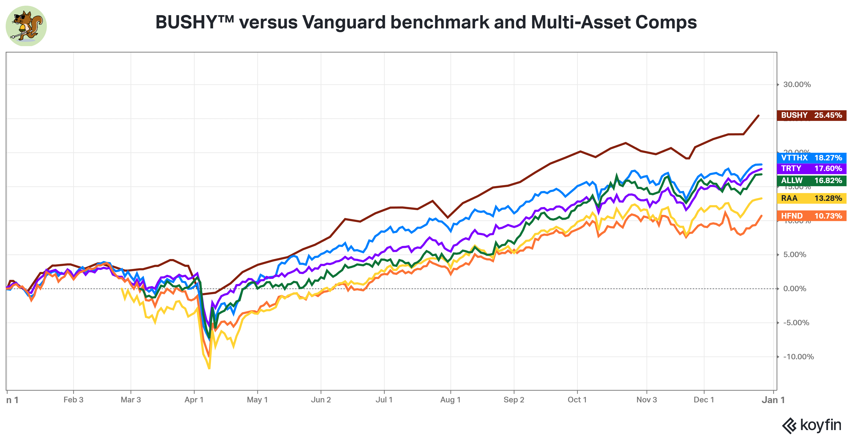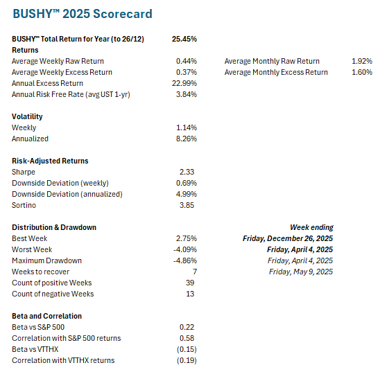 BUSHY⢠exhibited a low (0.58) correlation with S&P 500 weekly returns and had positive returns for 39 of the 52 weeks of the year. This week was in fact the best week of the year (thank you to âpet rocksâ and some chunky year-end ETF dividends). The đżď¸ is no fan of Sharpe ratios but I do care about drawdowns and downside volatility - as such, am delighted with BUSHYâ˘âs 3.85 Sortino ratio.