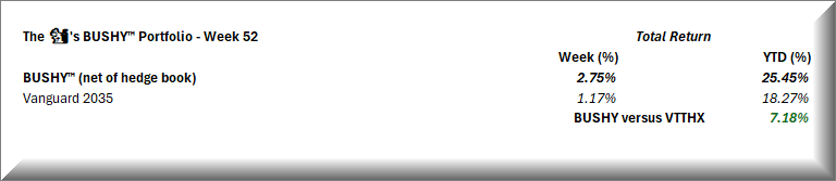 I want to start by taking a step back on BUSHYâ˘âs performance for 2025. I will rerun the numbers below for the calendar year end. However, with 3 trading days left in 2025, the numbers for the đżď¸âs beta portfolio are set out below.