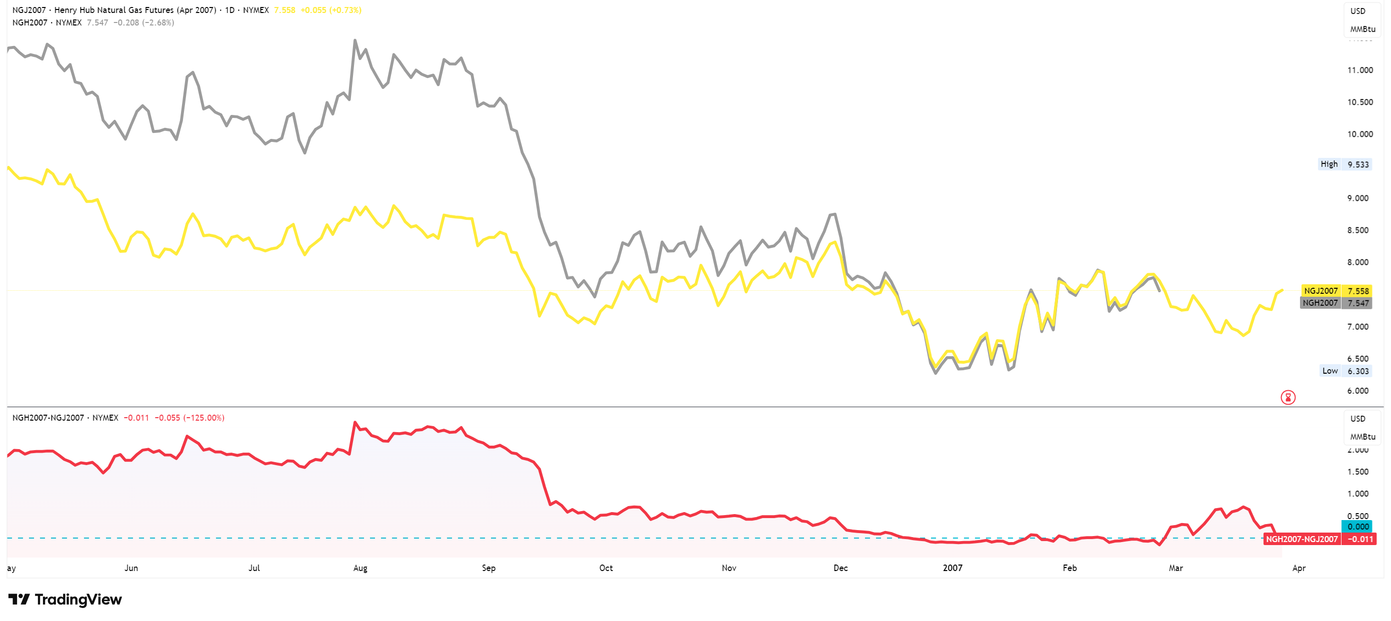 Amaranth’s chief energy trader, Brian Hunter, among various other eye-popping positions throughout the long term NG futures curve, was heavily long the notorious “H/J” spread in the Henry Hub natural gas futures market. Essentially this is when a trader is long the last ‘winter’ gas contract (March or ‘H’) against a short position in the first ‘summer’ contract (April or ‘J’).