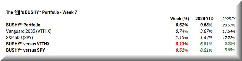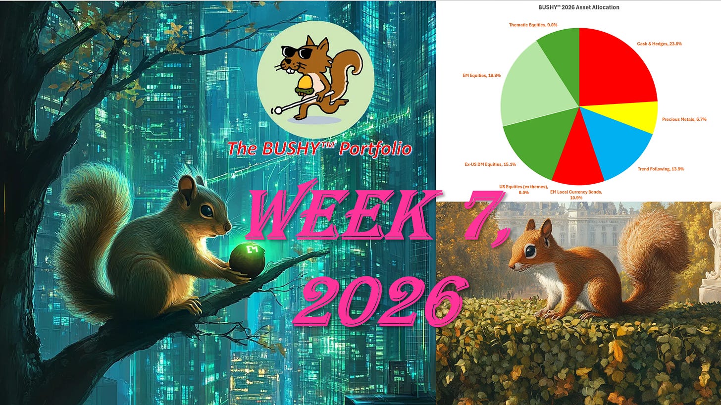 The 🐿️'s 'Start the Week' note! The implementation plan for the new ShinyAcorns™ basket. Plus our regular review of the BUSHY™ Multi Asset ETF Portfolio and live Acorn trade ideas. 2026, Week 7.