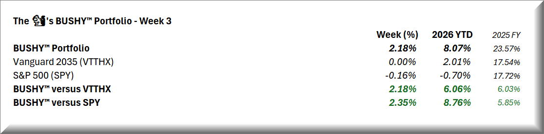 Precious metals, emerging markets and energy equity strength drove a Week 3 of solid outperformance by BUSHY™ versus benchmark and the S&P 500.