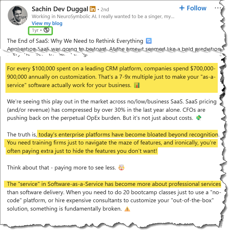 Last weekend, I flagged an old blog on the topic of SaaS “compression” by my podcasting partner Ben’s old friend, Sachin Dev Duggal, founder of SeKondBrain.AI. It turns out that the SaaS ‘compounders’ weren't compounding utility - they were really just compounding administrative bloat and keeping IT consultants busy!