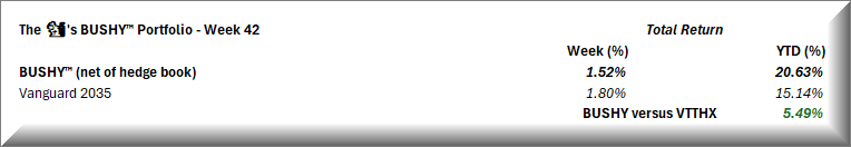 BUSHY™ had a strong week. It would have kept pace with benchmark without a -35bps headwind from the hedge book (drawdowns from the new gold collar and the FX hedges against a USD rally). I suspect that these hedges will do their job at some stage between now and year end.