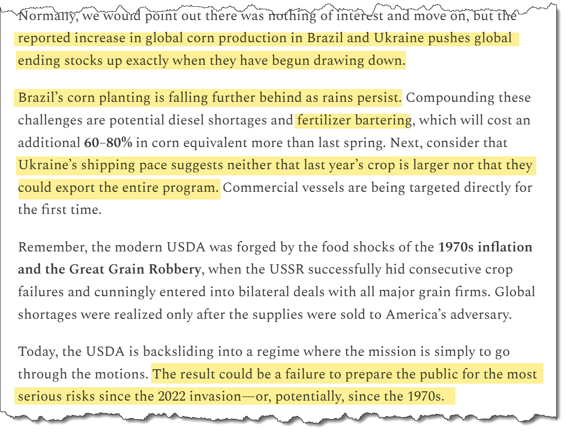 I am going to put the splits, sizing and risk management plan (and BUSHY™ allocation) as well as futures alternatives for corn and wheat in tomorrow’s ‘Start the Week’ note for paid subscribers. Will also add some ‘fire and forget’ futures options ideas that have a bit more convexity.