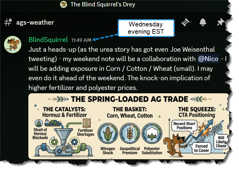 Before we dive into this week’s fertilizer-adjacent theme a repeat PSA for paid subscribers: a lot is happening intra-week at the moment since acts of war no longer uniquely occur between Friday’s Globex close and the Sunday evening futures session.