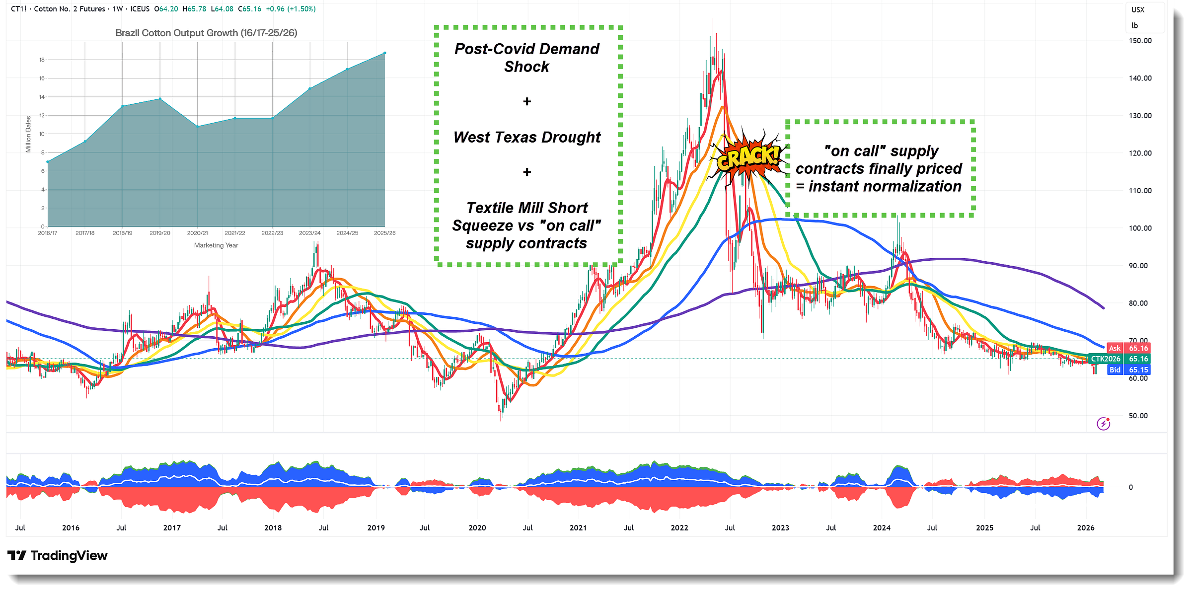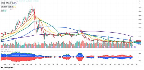 Nico has been pounding the table on cotton valuation for a while. I have been listening but have fallen for cotton optimism a couple of times unsuccessfully in recent years. Cotton has been in a bear market since the unwind of the great cotton short squeeze (inflicted on the textile mills) of 2020 to 2022.