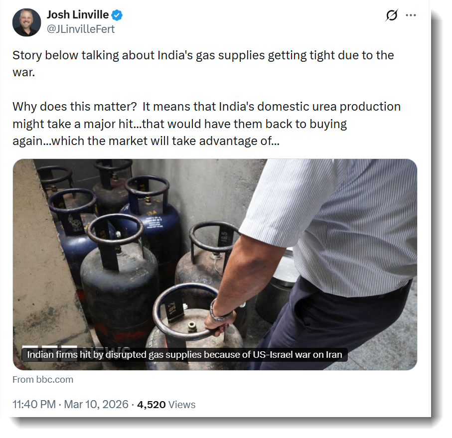 Importers of nitrogen-based fertilizer in emerging markets face immediate shortages - Nico reports that producers in Brazil are already seeing barter costs surge by 60-80%. A diesel shortage - that could potentially trap ag crops inland - also looms. But the real impact will be felt down the line. Northern Hemisphere spring grain planting season is peak demand time for nitrogen fertilizers.