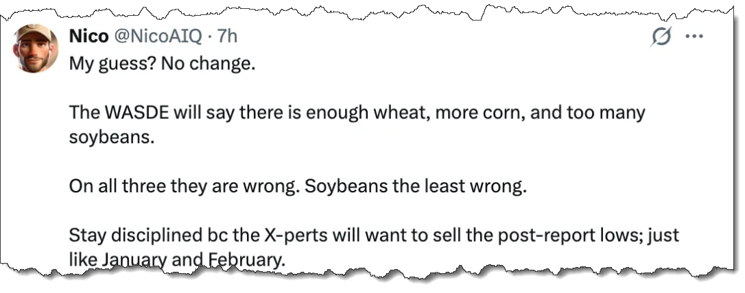 Nico reckons that wet weather in these regions may impact volumes - “It’s not problematic yet, but it’s not the ideal setup the USDA keeps reflecting as they hike production each report.”