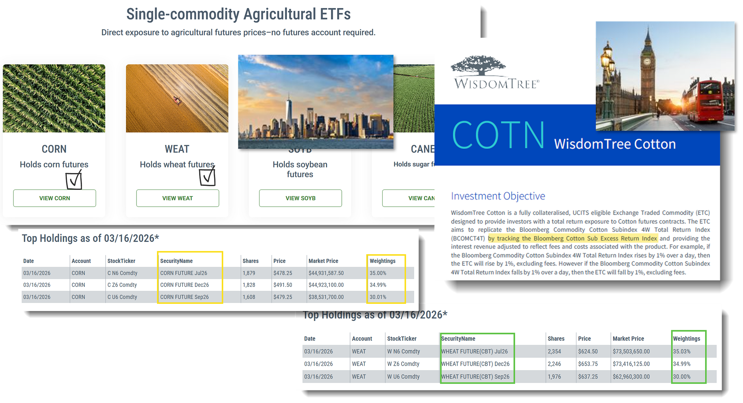 Long term 🐿️ readers will be familiar with the suite of single Ag-futures backed ETFs from Teucrium. They offer products for exposure to a blend of 3 futures contracts across the curve on both corn CORN 0.00%↑ and wheat WEAT 0.00%↑ (contract splits below).