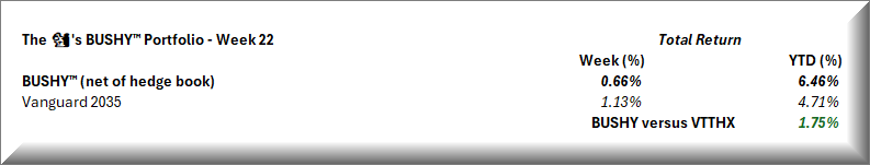 Another solid week for BUSHY™ (+0.66%), with another new weekly closing high for the portfolio (now +6.46% YTD).