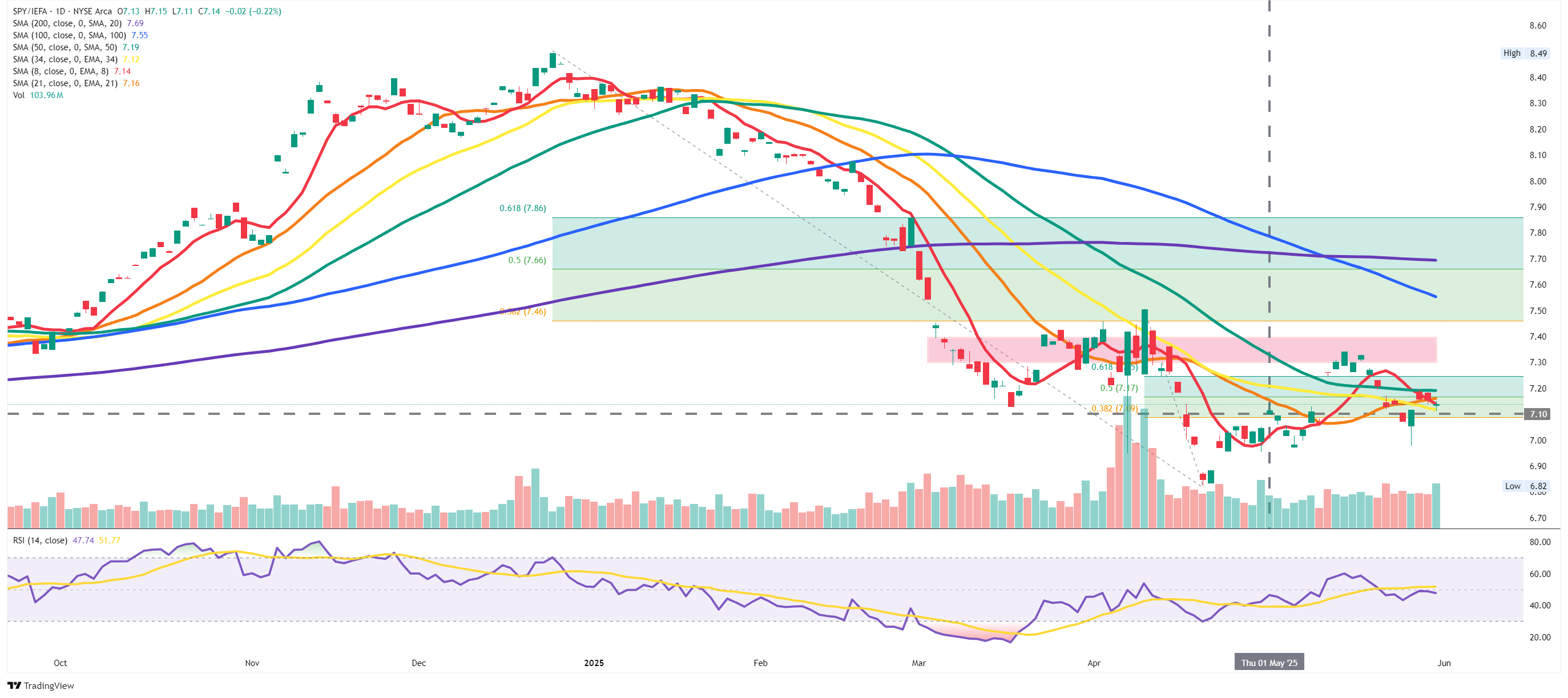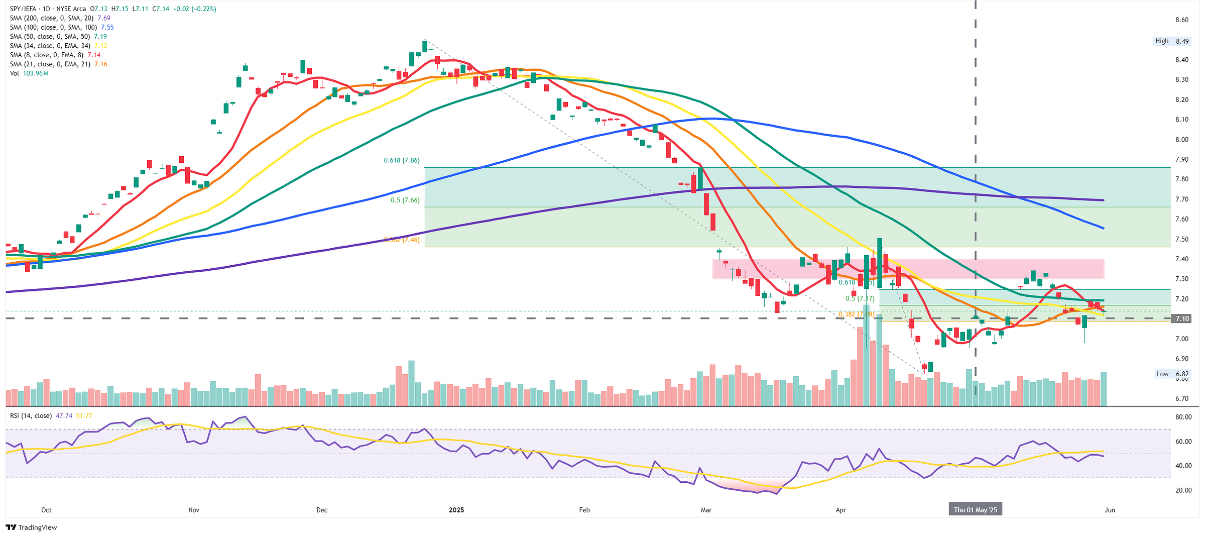 The 🐿️ is being reminded everywhere that - even with that missing general - the S&P 500 just had its best May since the 🐿️ was a teenager back-packing in Peru in 1990. Surely that would mean that my favorite 2025 ‘chart of truth’ - the ratio of the S&P SPY 0.00%↑ versus the MSCI EAFE IEFA 0.00%↑ would have put in a meaningful countertrend rally. Not so much.
