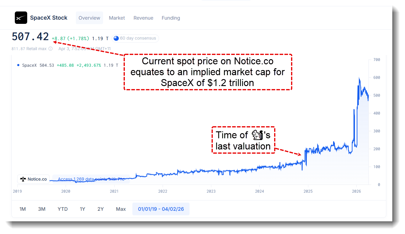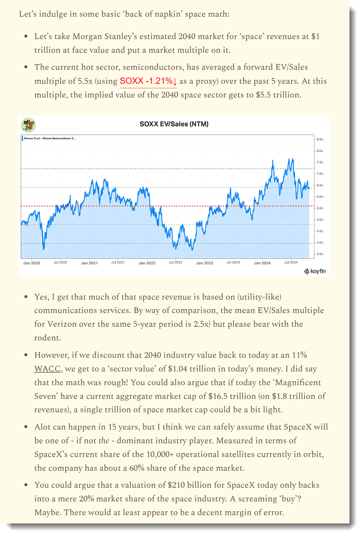However, when we start bandying around fighting talk like “concept valuation paper”, it behooves us to show our workings. The 🐿️ had a crack at handling the topic of valuing SpaceX back in October 2024 (‘To Boldly Go’). An extract: