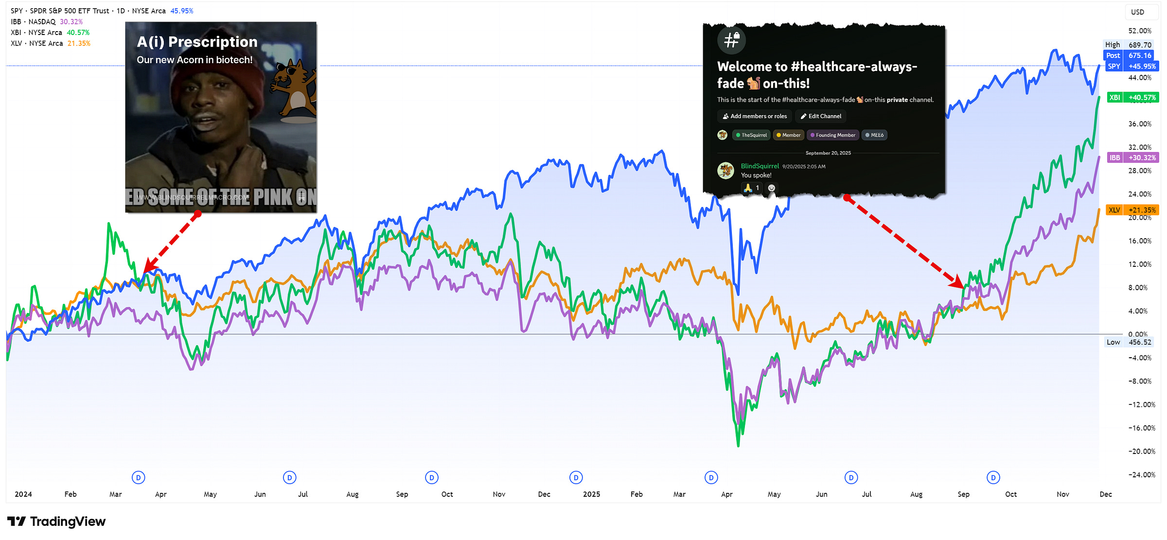 It’s a testament to my smart readers that since that date, not only has that sector channel become one of the busiest but also XBI 0.00%↑ (“biotech on nitro”), IBB 0.00%↑ (“broad-based biotech”) and XLV 0.00%↑ (“big healthcare”) have outperformed the S&P 500 by 25%, 20% and 16%, respectively. Kudos to them, my readers (and my podcasting partner Ben Brey) have crushed it. The 🐿️ has sadly not participated😔. Yet!