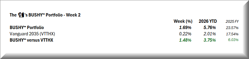 Yes, it is still too early in the year for portfolio return stats to be meaningful, but BUSHY™ benefited from a solid ‘Week 2’ of 2026.