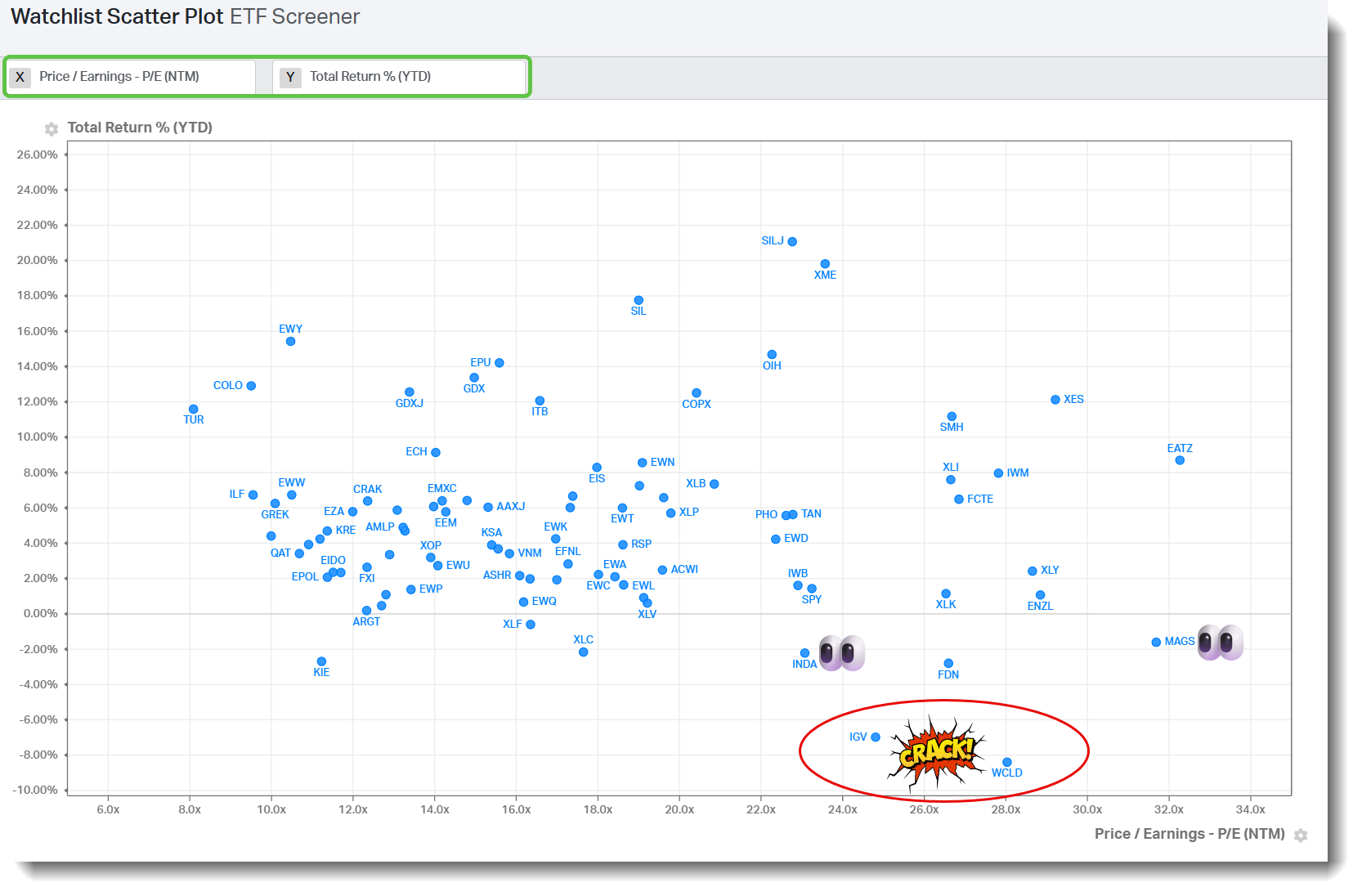 The scatter plot illustrates YTD performance for the group versus a simple forward PE (NTM) metric.