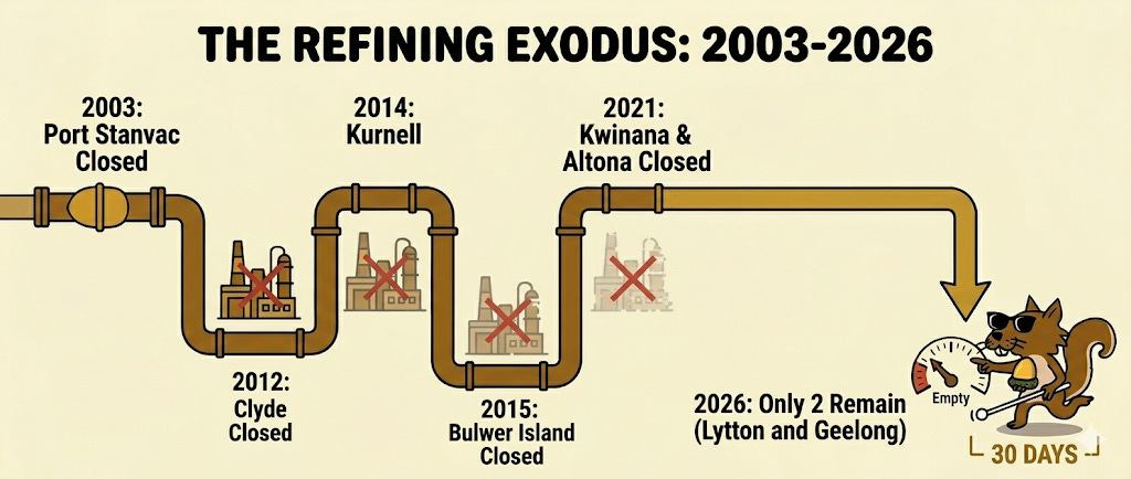 As of early 2026, Australia refines less than 20% of its domestic annual consumption of gasoline, diesel, and aviation fuel. The only remaining operational assets are Ampol’s Lytton refinery in Brisbane (110kb/d) and Viva Energy’s Geelong refinery (120kb/d).
