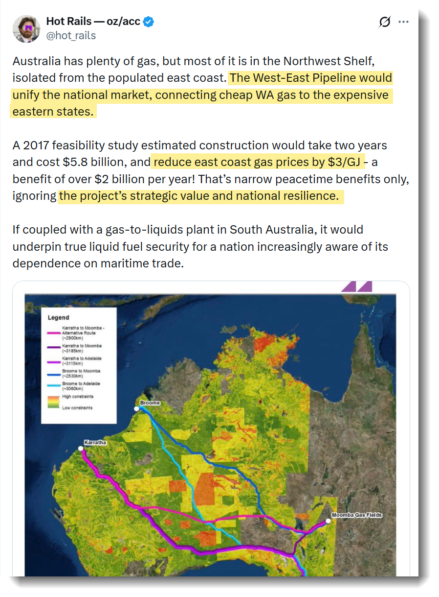 That should be just the start of it. Projects like the West-East gas pipeline have been kicked into the long grass by the consultant class in the past, I think the wake up calls of 2022 and today merit rescoring projects like this and its ilk through the prism of sovereign resilience.