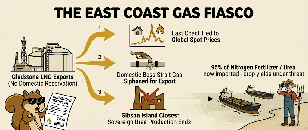 In the early 2010s, the Gillard/Rudd governments approved the construction of three massive Liquefied Natural Gas (LNG) export terminals in Gladstone, Queensland. At the time, the Federal Government argued against a domestic gas reservation policy (like the one that successfully protects Western Australia), claiming it would “discourage investment”.