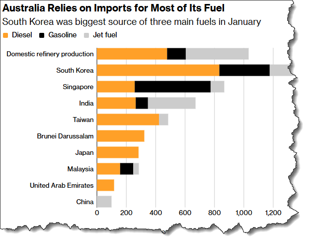 Storage might have helped with energy security but successive governments have balked at the A$20 billion bill for building the IEA-mandated 90 day stock requirement, arguing the toss that ‘product on water’ (en route from Asia) should be counted in the total. Cute (and inherently fragile).