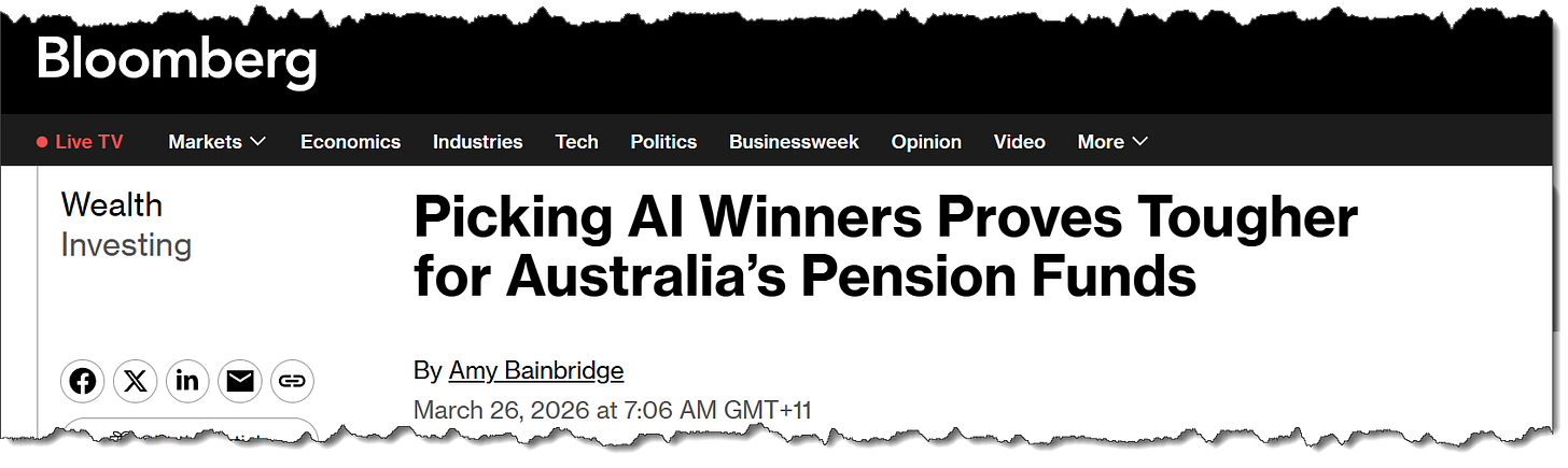 The super funds ran out of domestic bank stocks to buy a long time ago and have been increasingly lured offshore to camp out in US tech stocks, private equity and now more recently (and more scarily) private credit to US tech stock data center SPVs! Less than 6% of their AUM is allocated to domestic hard infrastructure.
