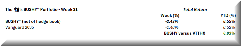 BUSHY™ portfolio had its largest drawdown since ‘Liberation Day’ last week, shedding 2.43%. Pain was pretty much across the board. Even the support that was being provided by the portfolio FX hedges faded with that big negative reversal in the US dollar after Friday’s weak jobs number.