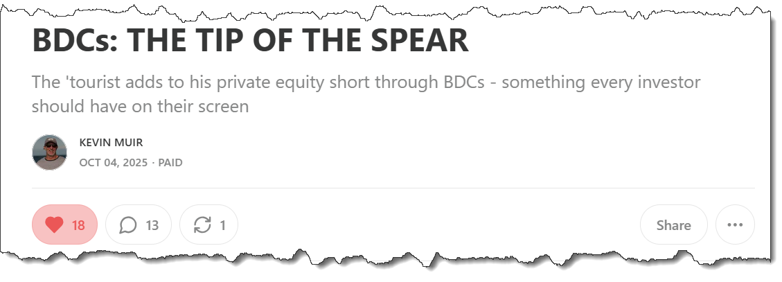 In the past couple of weeks, the BDCs (publicly listed private credit vehicles) have emerged from obscurity and are starting to become household names. I had a painful experience wearing the negative carry of shorting these things in 2023 (early = wrong!) and have been out of the broader ‘Team Saddlebags’ trade since the early summer.