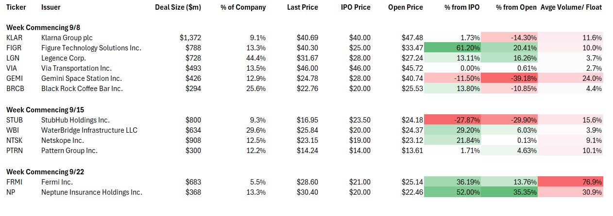 Both deals popped but feel like they were fueled by winners from the prior weeks. The crop from the week commencing 8th September was down almost 5% on average for the week. Both IPOs from this week (Fermi and Neptune) closed down sharply on Friday (reluctance to take weekend risk?). This is not a healthy picture.