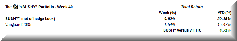 BUSHY™ added 92bps last week, lagging benchmark by 62bps but still well ahead on the year. I am pretty relaxed about the relative performance on week.