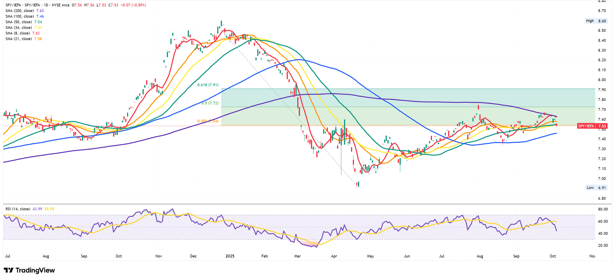 This FX fail comes at an interesting juncture for the 🐿️’s ‘Chart of Truth’ - we are now seeing repeated failure by the S&P 500 (SPY 0.00%↑) / MSCI EAFE (developed markets ex-US IEFA 0.00%↑) to break back above the 200-day SMA. It now looks like it wants to fail the Fibonacci retracements zones from the ‘Liberation Day’ lows.