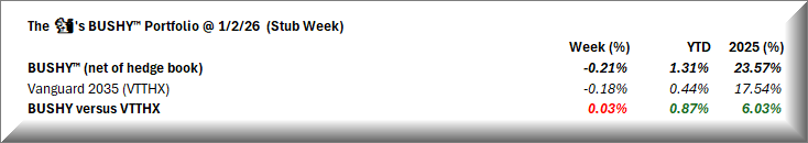 Starting on January 1st with zero runs on the board is the lot facing anyone managing a P&L. The inevitable correction in the metals after Christmas cost BUSHY™ about 1.5% of performance in the last few trading days of 2025, but the first trading day of 2026 on Friday clawed back most of that deficit and the closed “Week Zero” up 130 basis points. International exposures helped. I hope this sets the tone for the year.