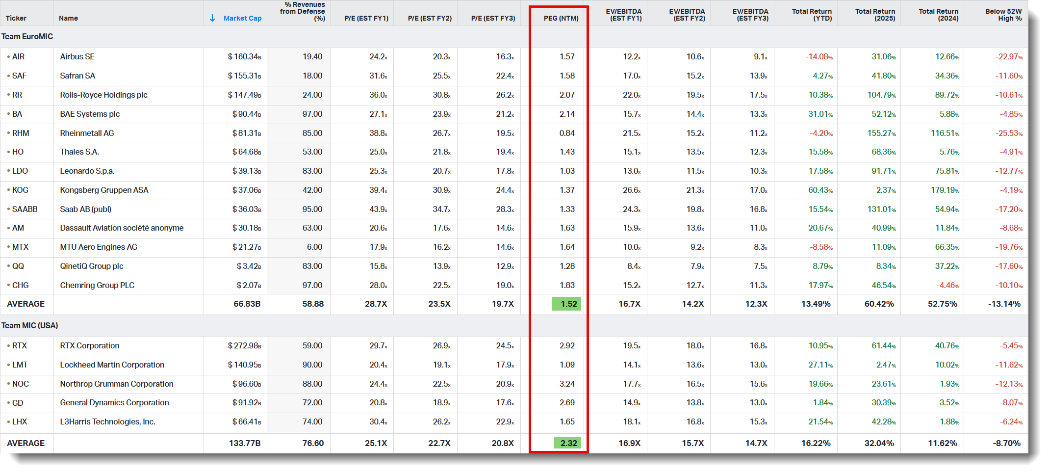 EuroMIC has comprehensively outperformed the broad-based European and US Aerospace and Defense sectors. However, on a growth adjusted basis, this European group still looks inexpensive relative to the US Military Industrial Complex giants.