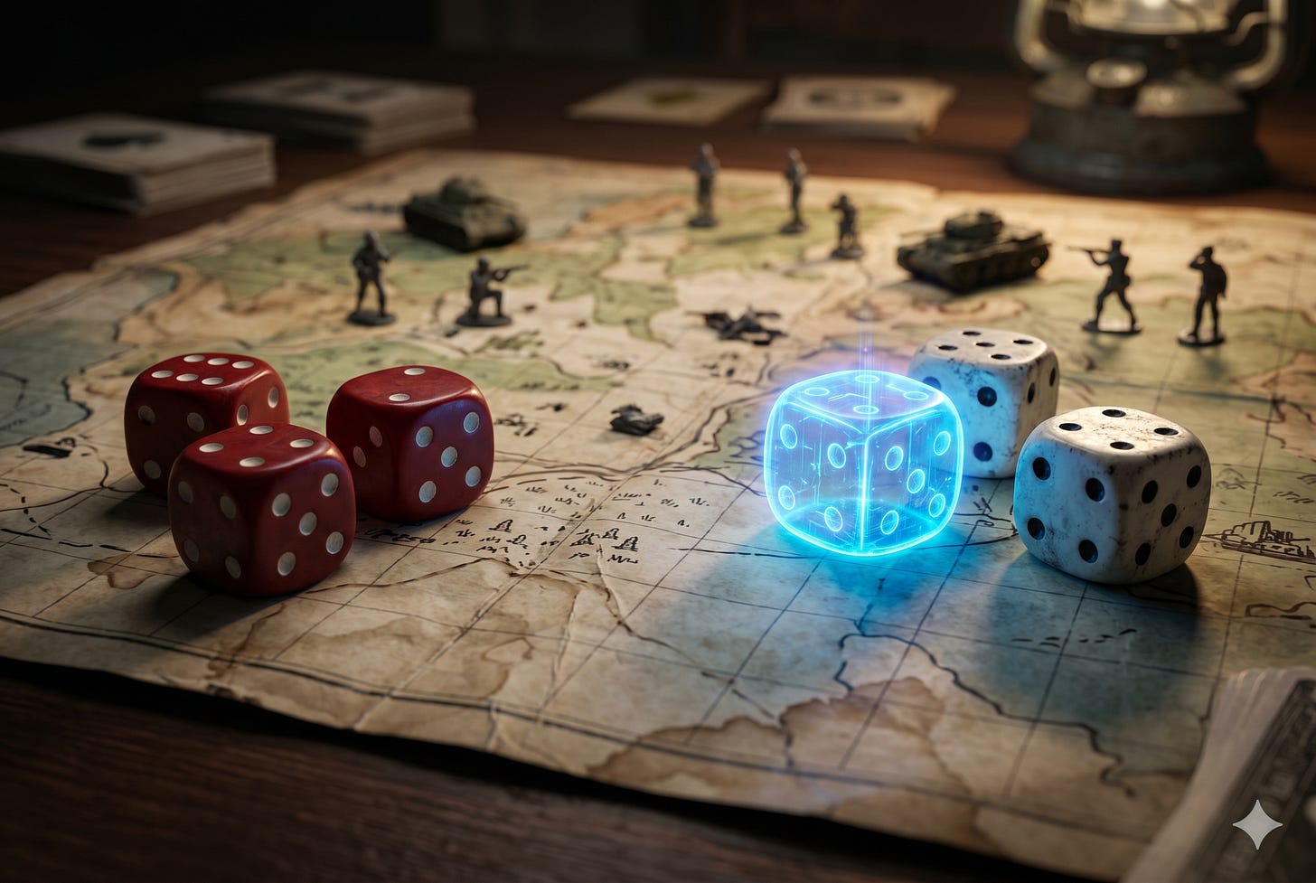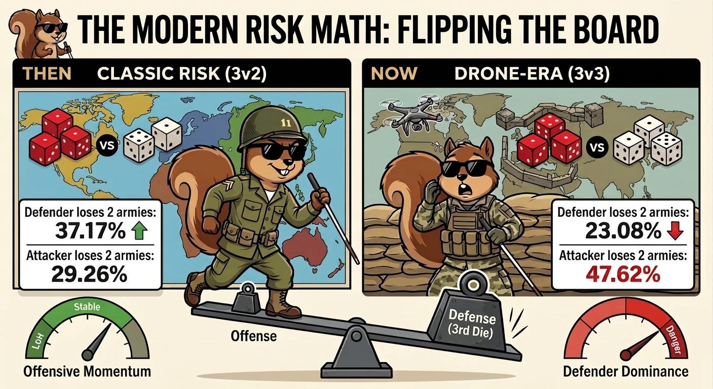 In this industrial era model, concentrating mass and taking the offensive yielded a statistical advantage. With three dice against two, the attacker can expect to have the 2 highest dice 37.2% of the time, while the defender only has them 29.3% of the time. This 8% spread in favor of the aggressor - even after accounting for the fact that defenders win ties - dictates the entire strategy of the game.
